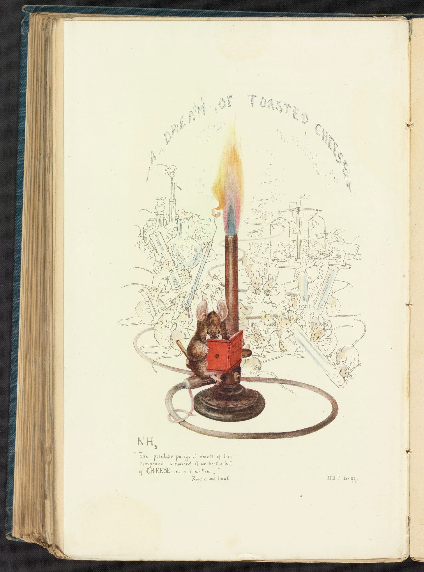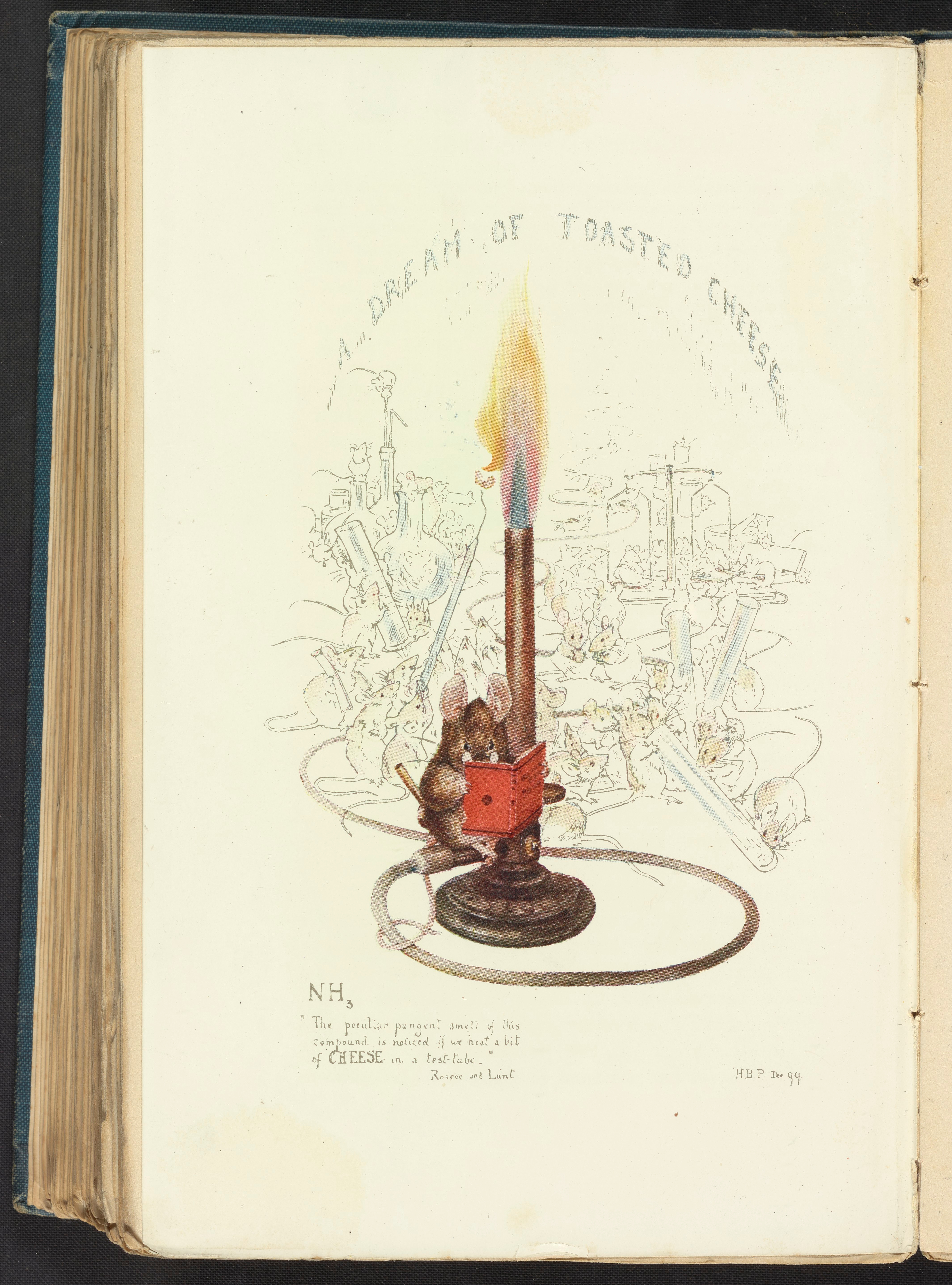 Beatrix’s gratitude produced this wonderful card for her uncle, which combines her love of fantasy, animals and the scientific. It references a textbook on inorganic chemistry that Henry Roscoe wrote which refers to the smell of toasted cheese.